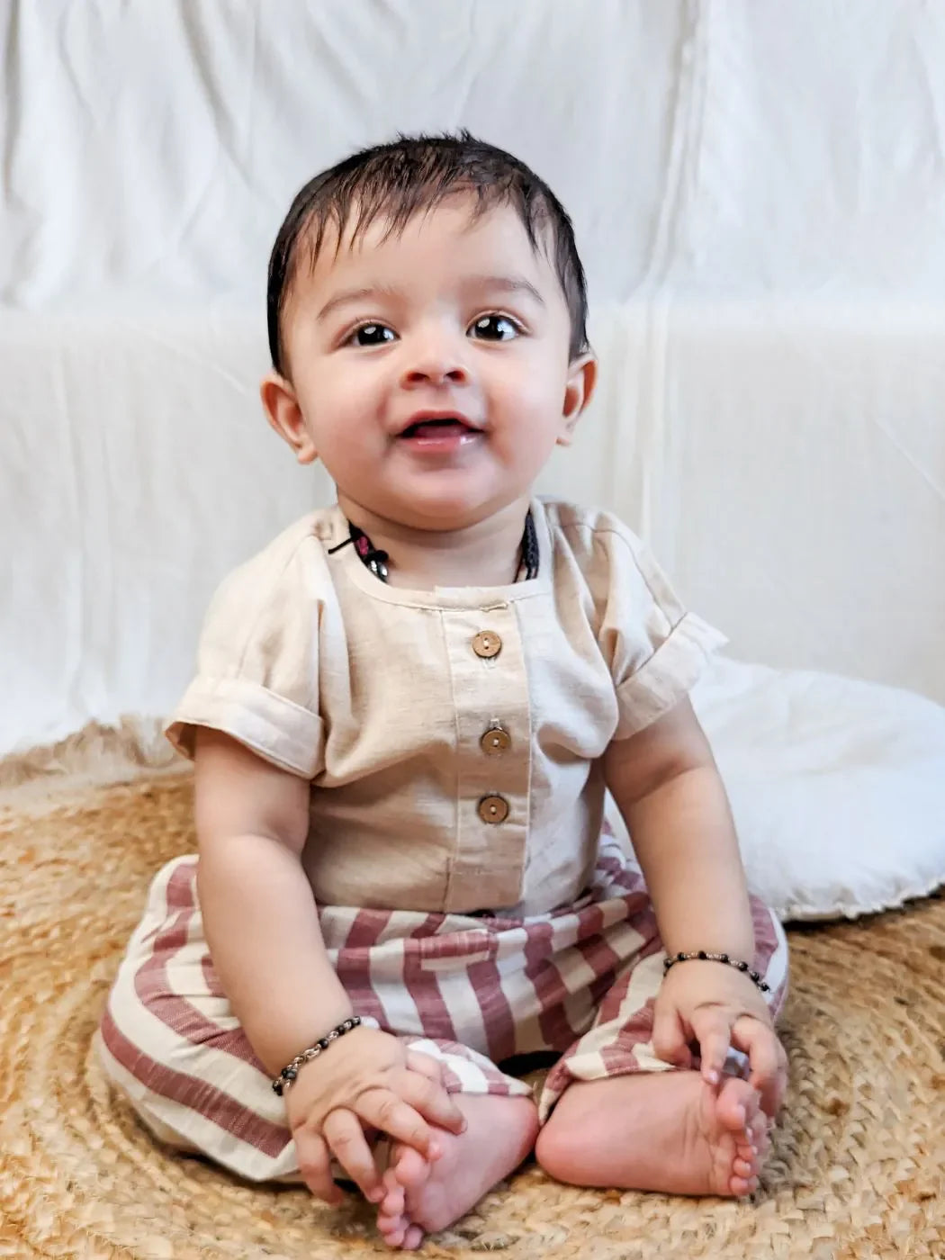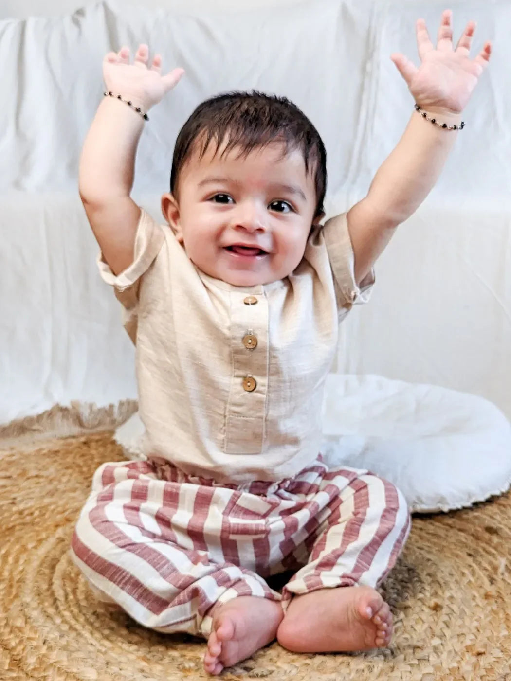 BOTTOM : Made with 100% soft khadi cotton, these brown stripe breathable and lightweight pants ensure all-day comfort. Designed with practical side pockets and playful stripes, they are ideal for any child's active day.