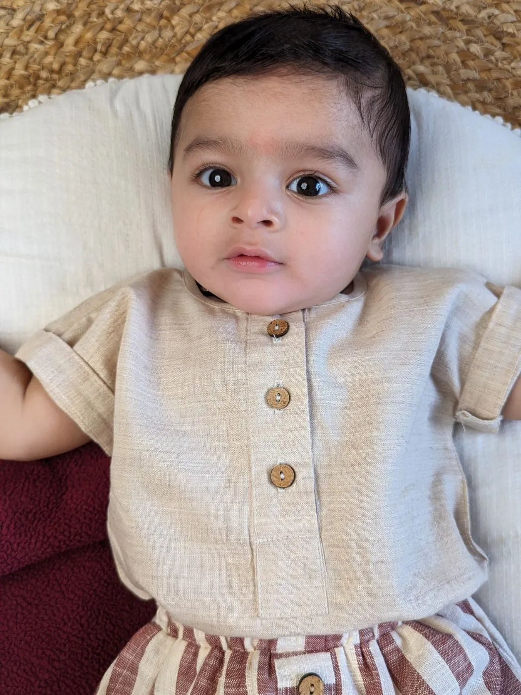 TOP : Sustainable and gentle on the skin, This beige top have front opening and fastened with wooden buttons. These is a cute side pocket on one side. They are a smart choice for parents who value comfort and sustainability.
