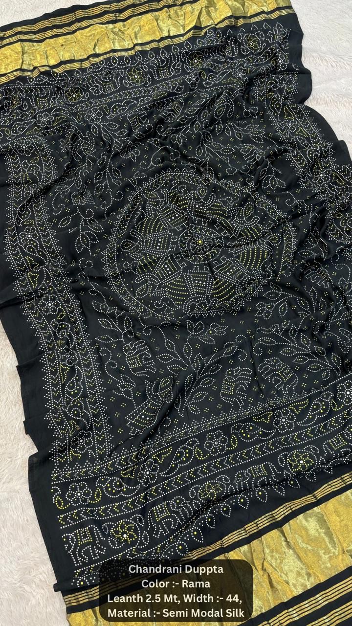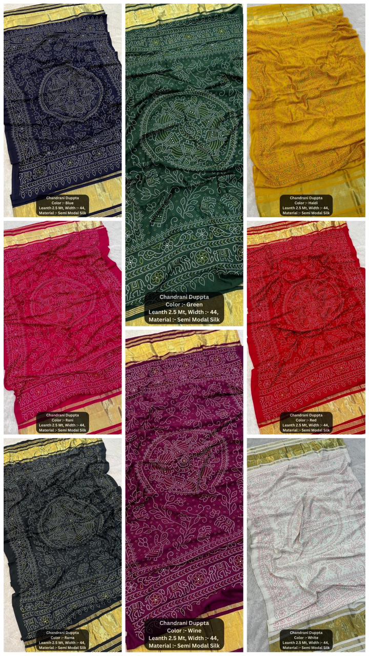A Chandrakani dupatta is a traditional Indian scarf made from semi-modal silk, featuring vibrant prints and intricate lagdi patti (applique) work. Originating from Gujarat and Rajasthan, this elegant dupatta adds a touch of sophistication to ethnic outfits like lehengas, salwar kameez, and sarees.