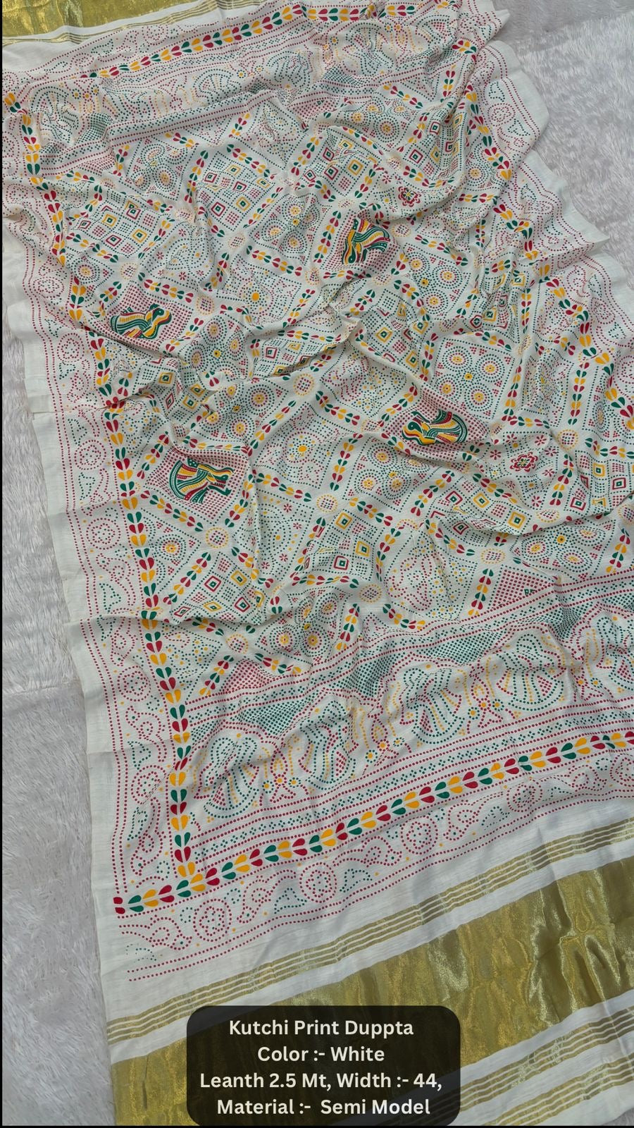 A Kutchi dupatta is a traditional Indian scarf made from semi-modal silk, featuring vibrant prints and intricate lagdi patti (applique) work. Originating from Gujarat and Rajasthan, this elegant dupatta adds a touch of sophistication to ethnic outfits like lehengas, salwar kameez, and sarees.