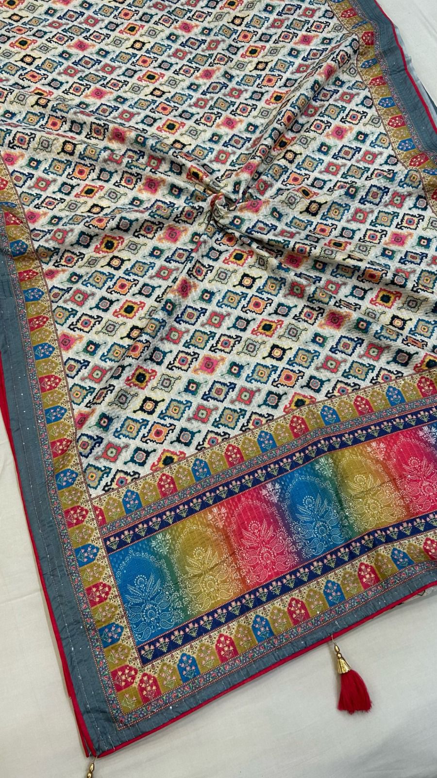 Make a bold fashion statement at every event with this unique Digital Print Saree. The fusion of modern design, luxurious Kora Silk, and delicate sequin work ensures you stand out with elegance and style.