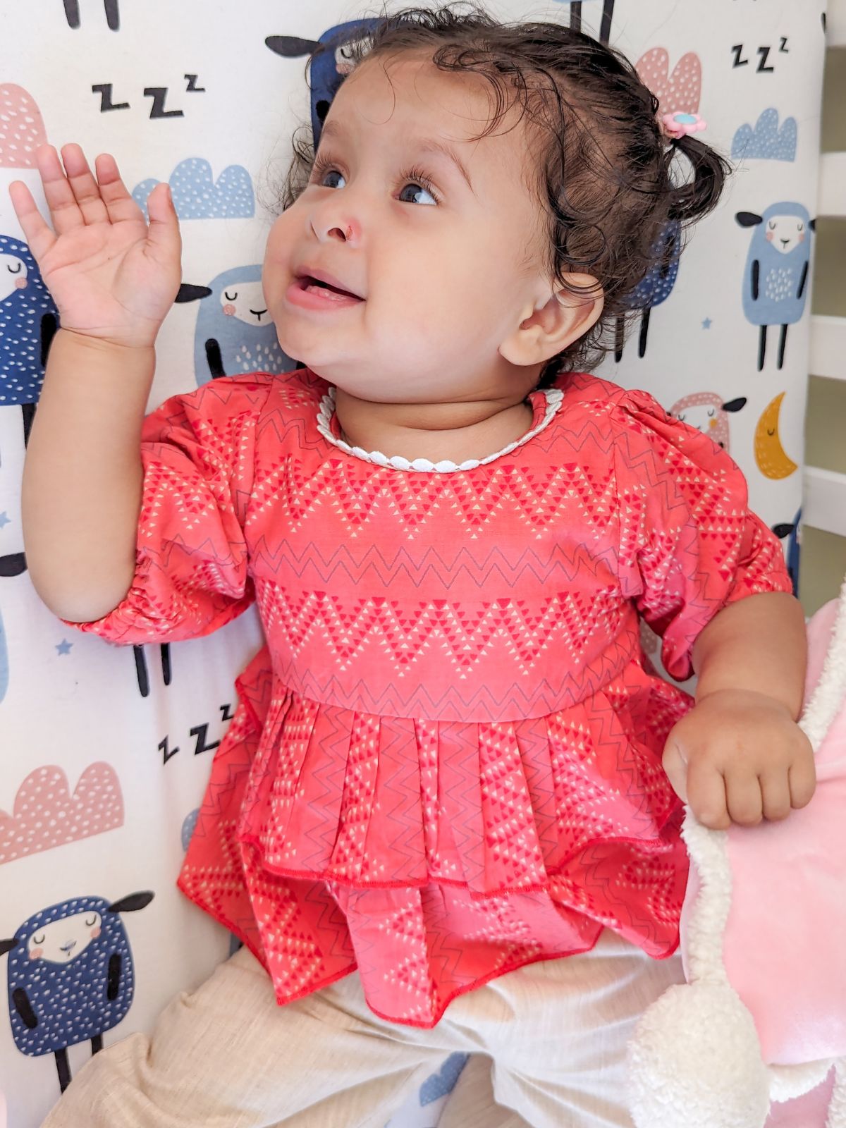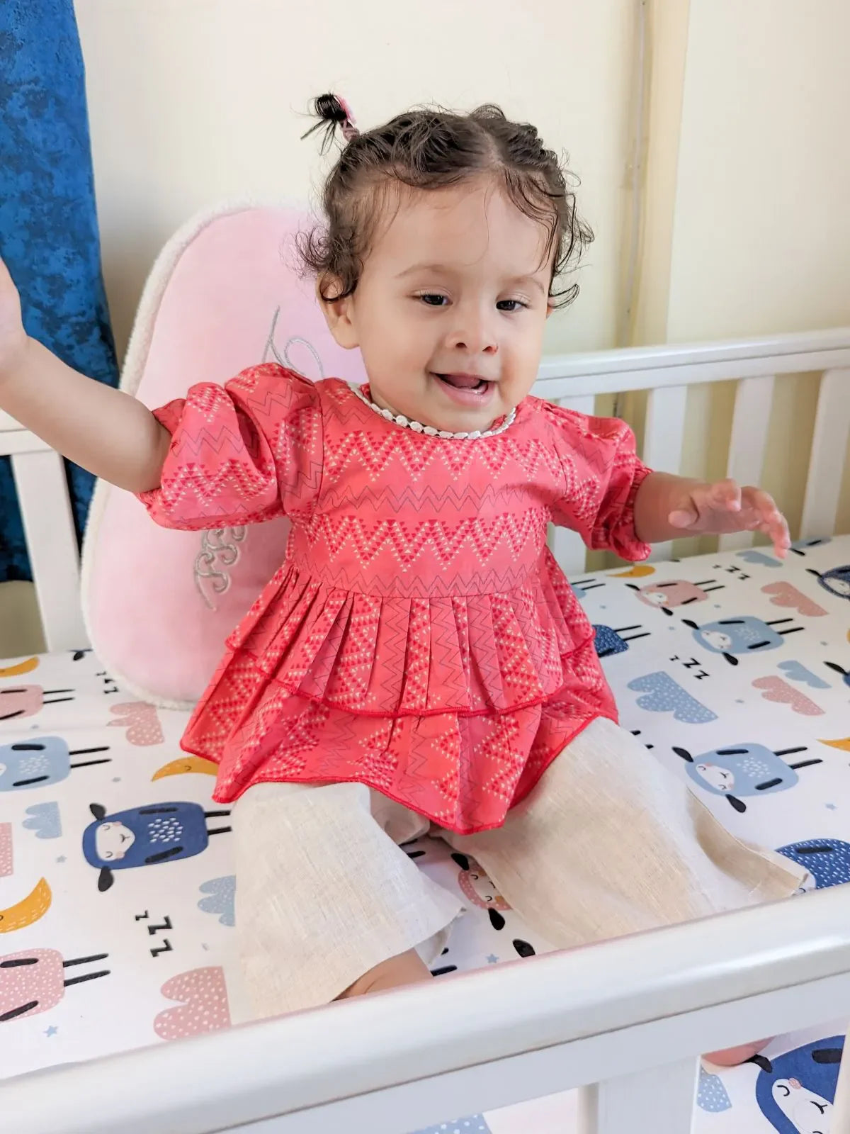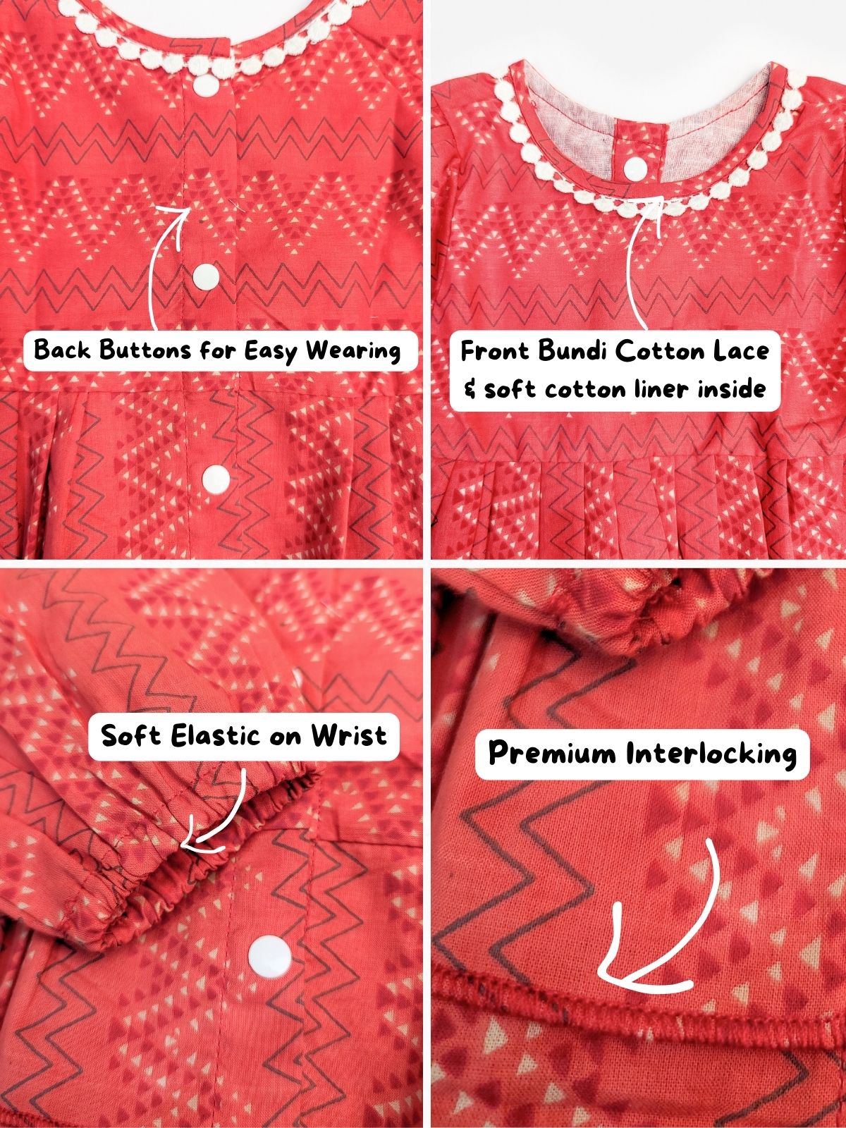 Floral Printed Pure Cotton Dia Girls Top Bottom Set- RED