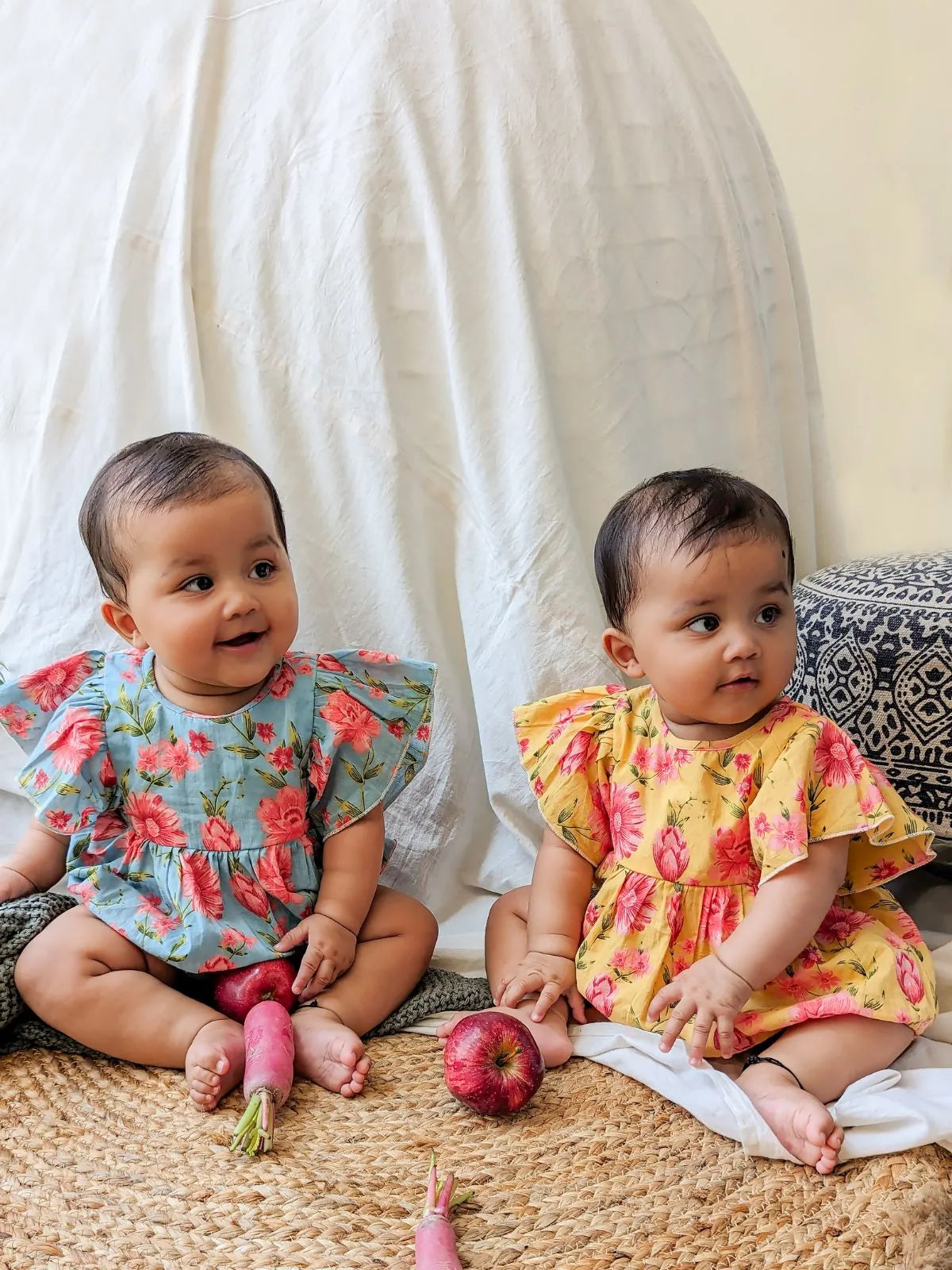 eye-catching floral prints. Designed for easy wear with a back and diaper opening,