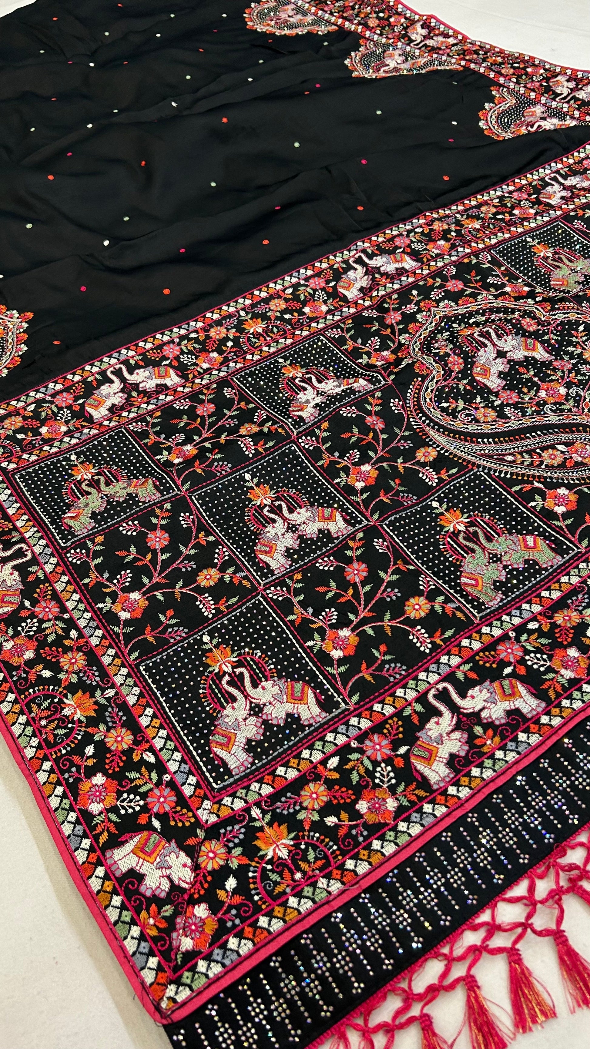 "Indulge in timeless elegance with our Kutchi embroidery black saree. Elevate your style quotient and make a statement at any occasion. Order now to add this exquisite piece to your wardrobe."