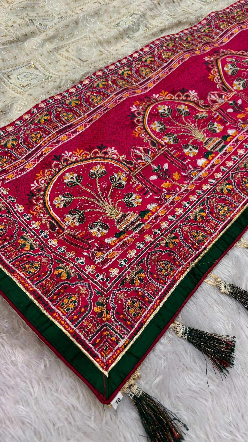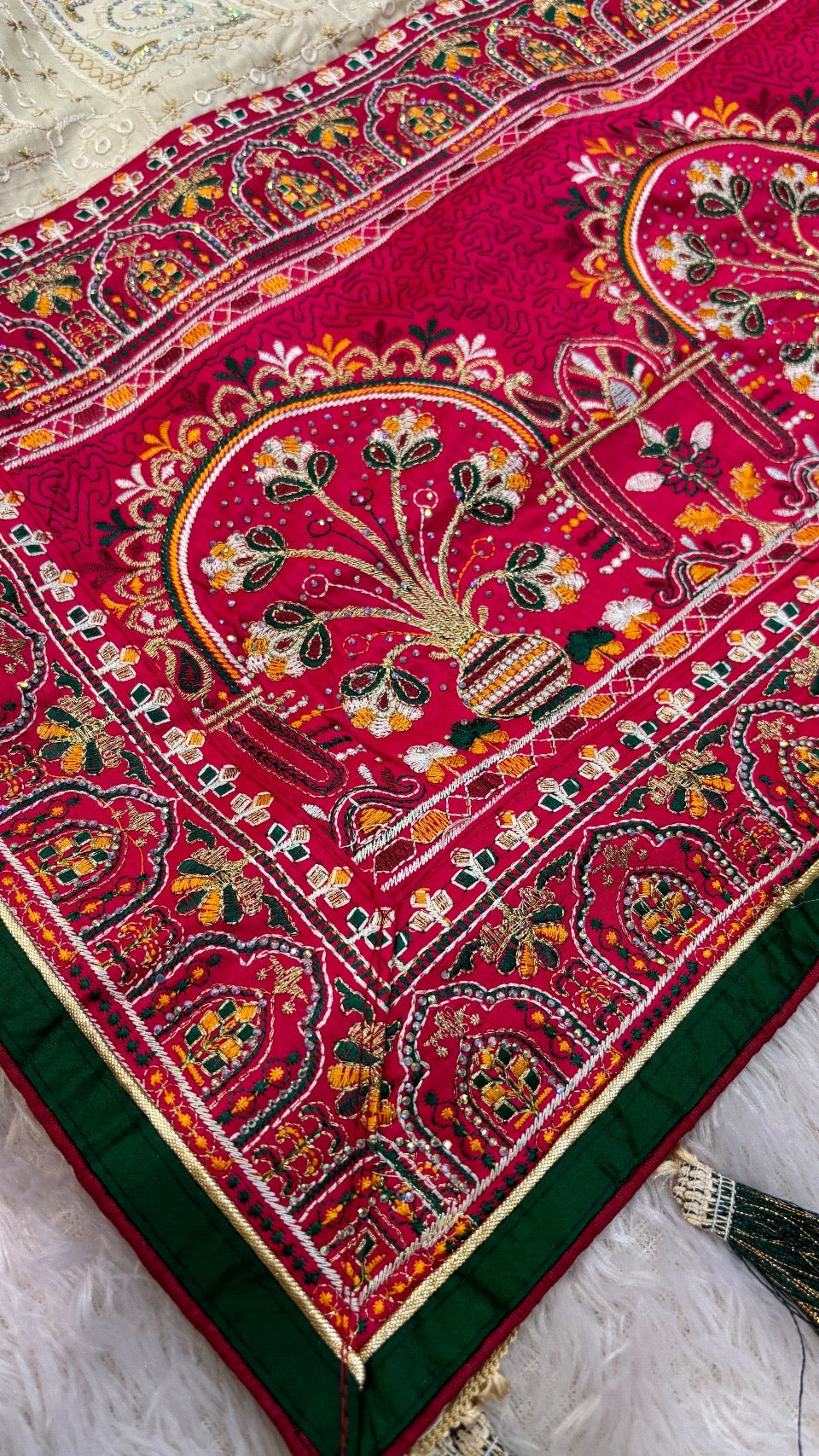 Lakhanavi & Kutchi Artistry: Immerse yourself in the intricate artistry of Lakhanavi and Kutchi Gharchola work, each woven into the fabric with precision. The saree showcases a fusion of these two traditional techniques, creating a visual symphony of heritage and elegance.