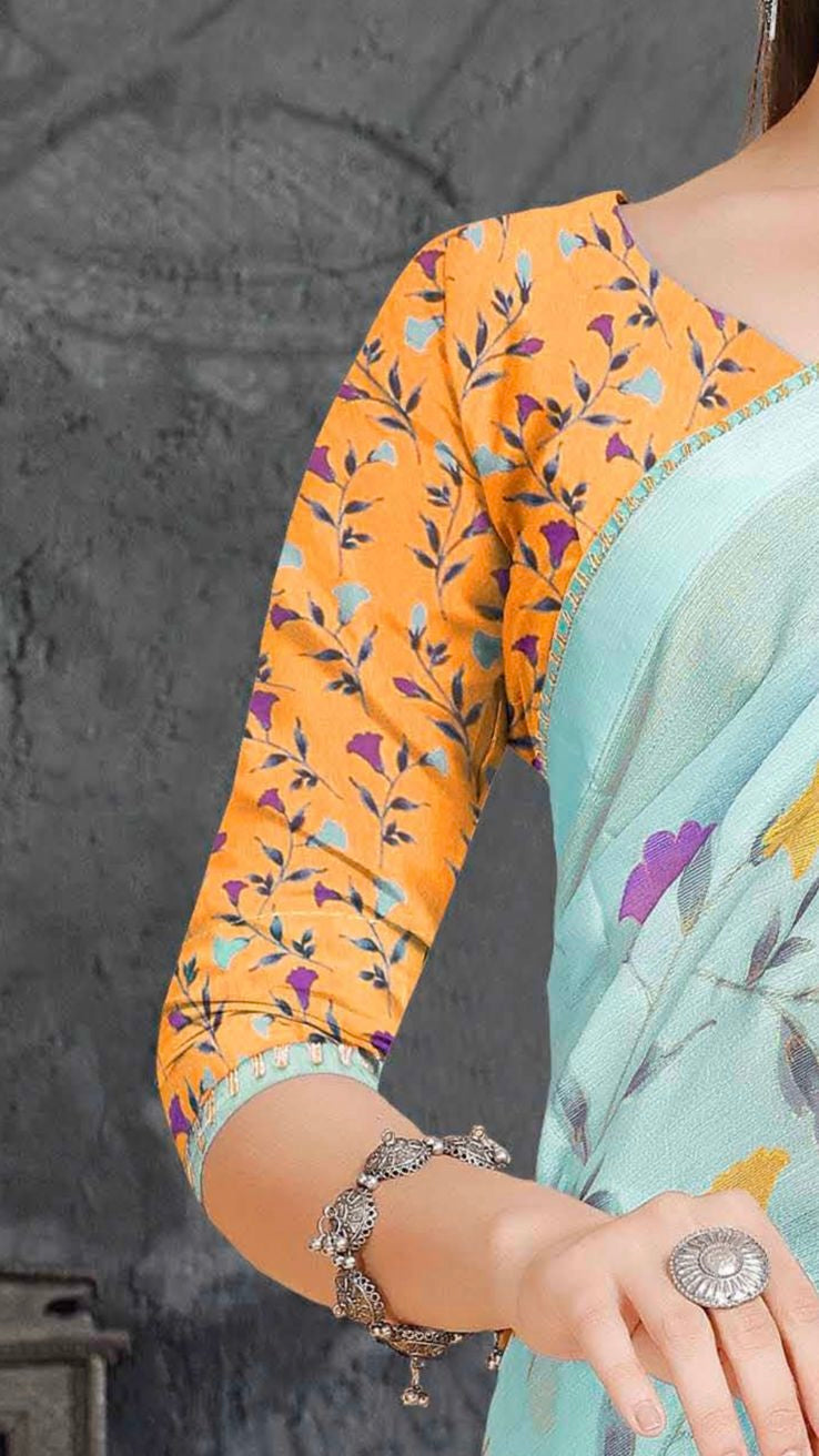 - The blouse is designed in a contrast pattern, adding an element of visual interest and modern flair to the traditional saree. The contrasting design enhances the overall look, creating a striking and fashionable ensemble.