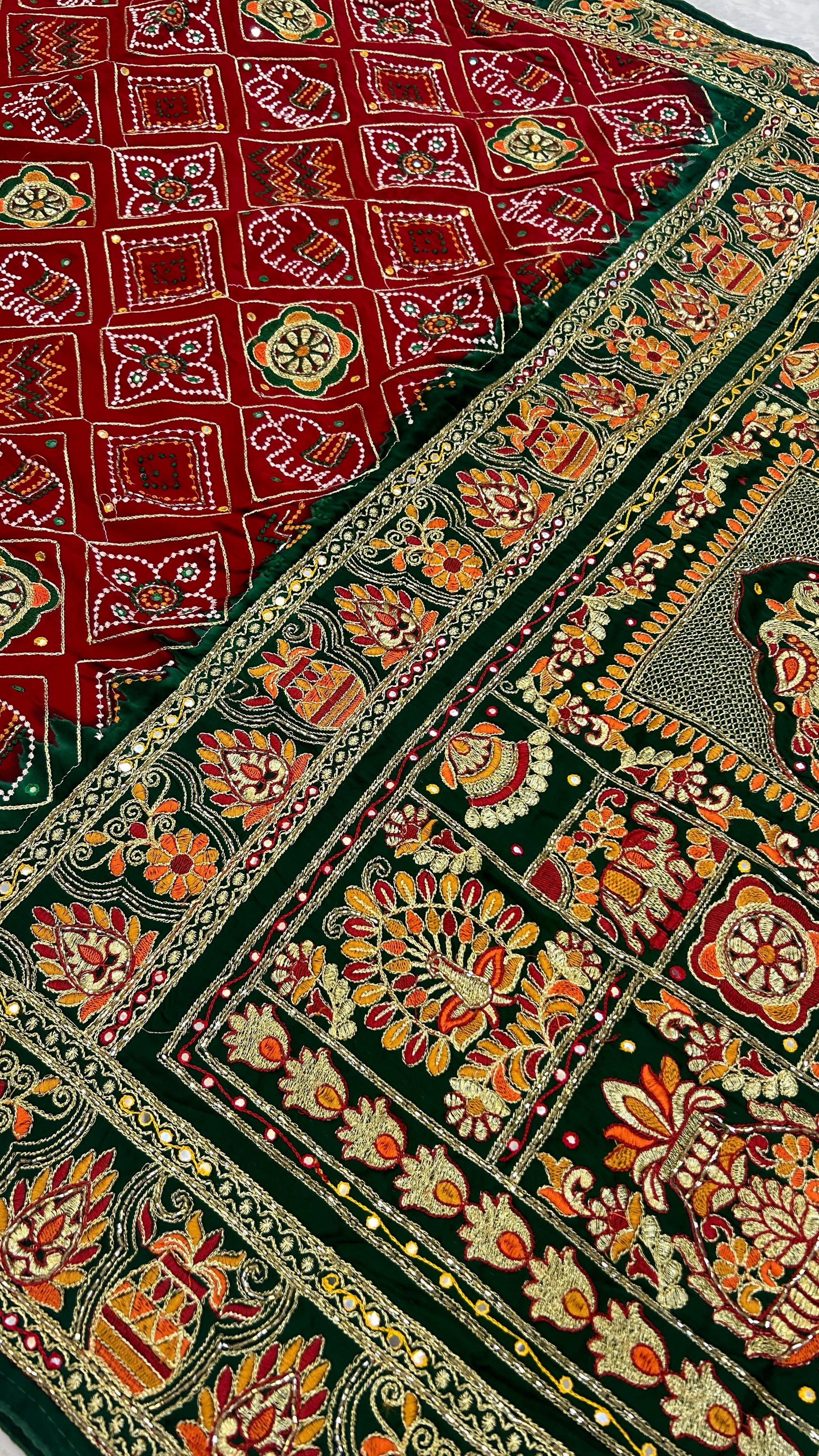 100% Hand Work Detail: Each inch of this Gharchola Saree is a masterpiece with 100% handwork, combining meticulous threadwork, stone embellishments, and embroidery for an exquisite finish.