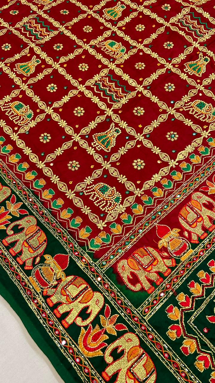 100% Hand Work Detail: Each inch of this Gharchola Saree is a masterpiece with 100% handwork, combining meticulous threadwork, stone embellishments, and embroidery for an exquisite finish.