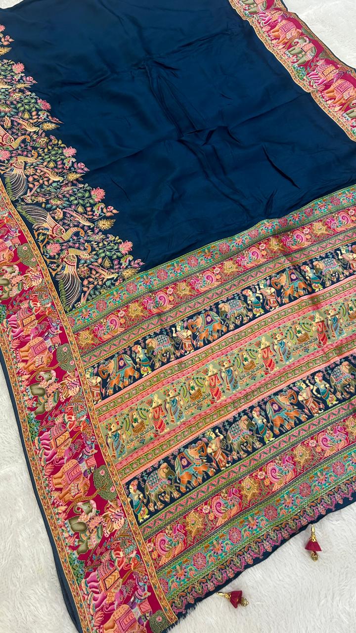 "Draped in resplendent colors reminiscent of royal courts, this exquisite handwoven saree bears the hallmark of Rajwadi grandeur, with intricate motifs and luxurious fabrics weaving together a tapestry of majestic elegance fit for a queen."