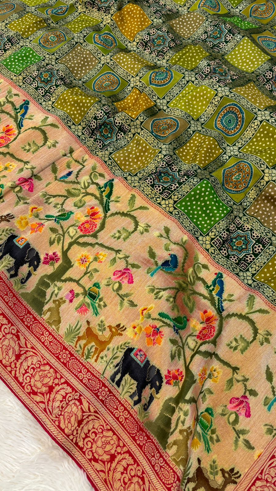"Draped in resplendent colors reminiscent of royal courts, this exquisite handwoven saree bears the hallmark of Rajwadi grandeur, with intricate motifs and luxurious fabrics weaving together a tapestry of majestic elegance fit for a queen."