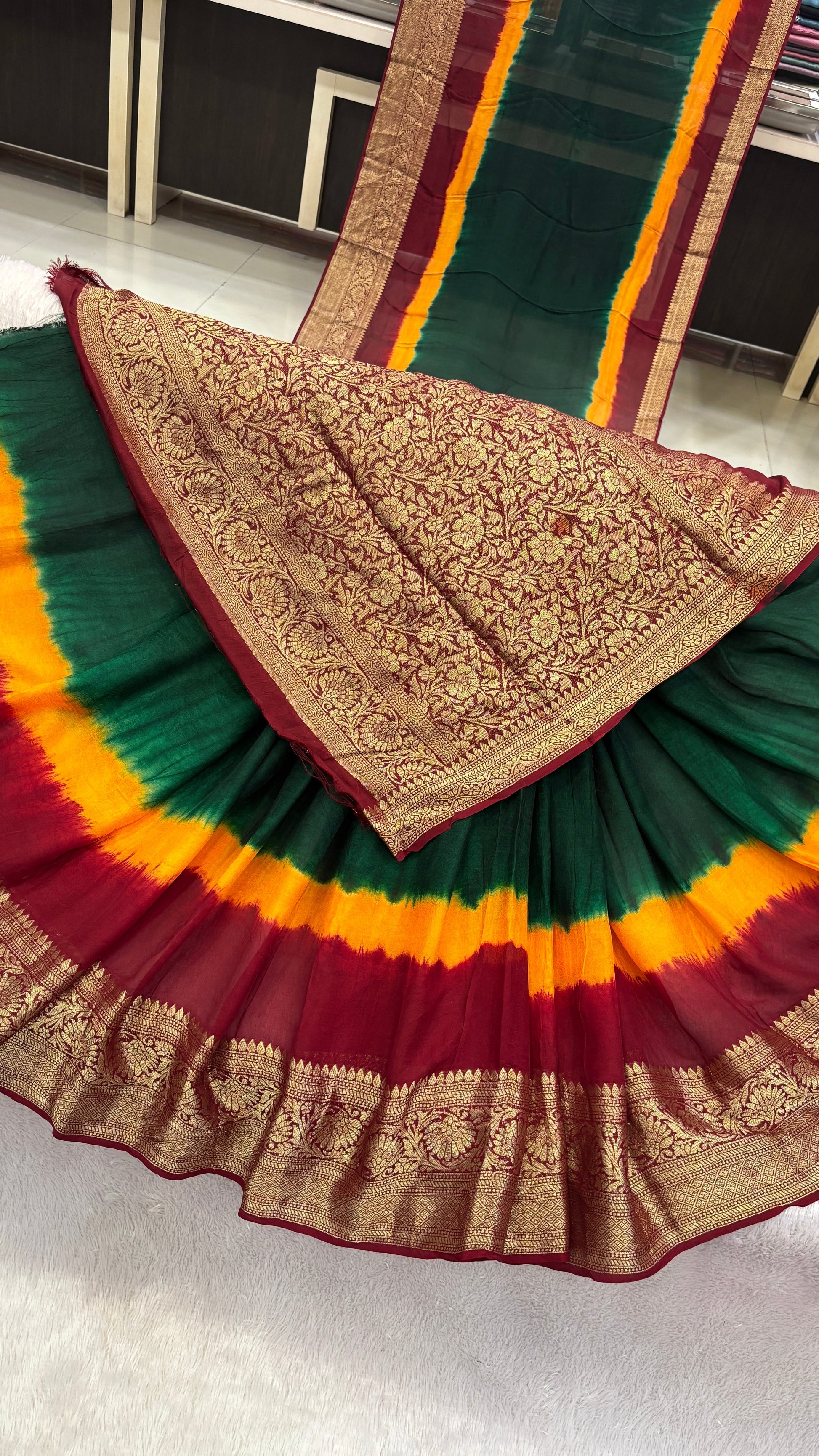 “A regal blend of Banarasi elegance and vibrant Bandhej hues, draped in timeless tradition.”