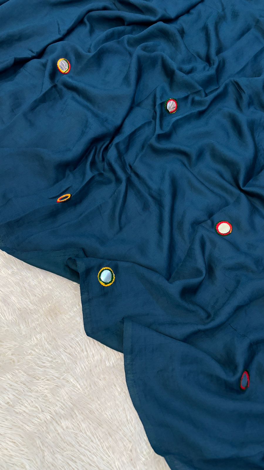 - The plain base is beautifully adorned with intricate mirror work, creating a shimmering effect that adds elegance to any ensemble.