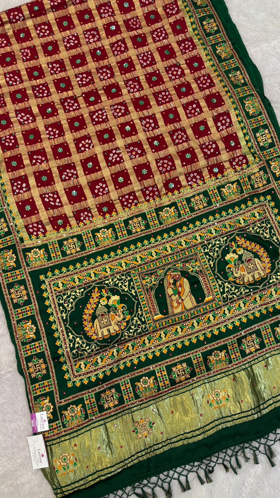 Intricate Handwork Detailing: Adorned with 100% handwork, the Bhatiya Chex Gharchola design showcases meticulous craftsmanship, adding a touch of uniqueness and cultural significance to every piece.