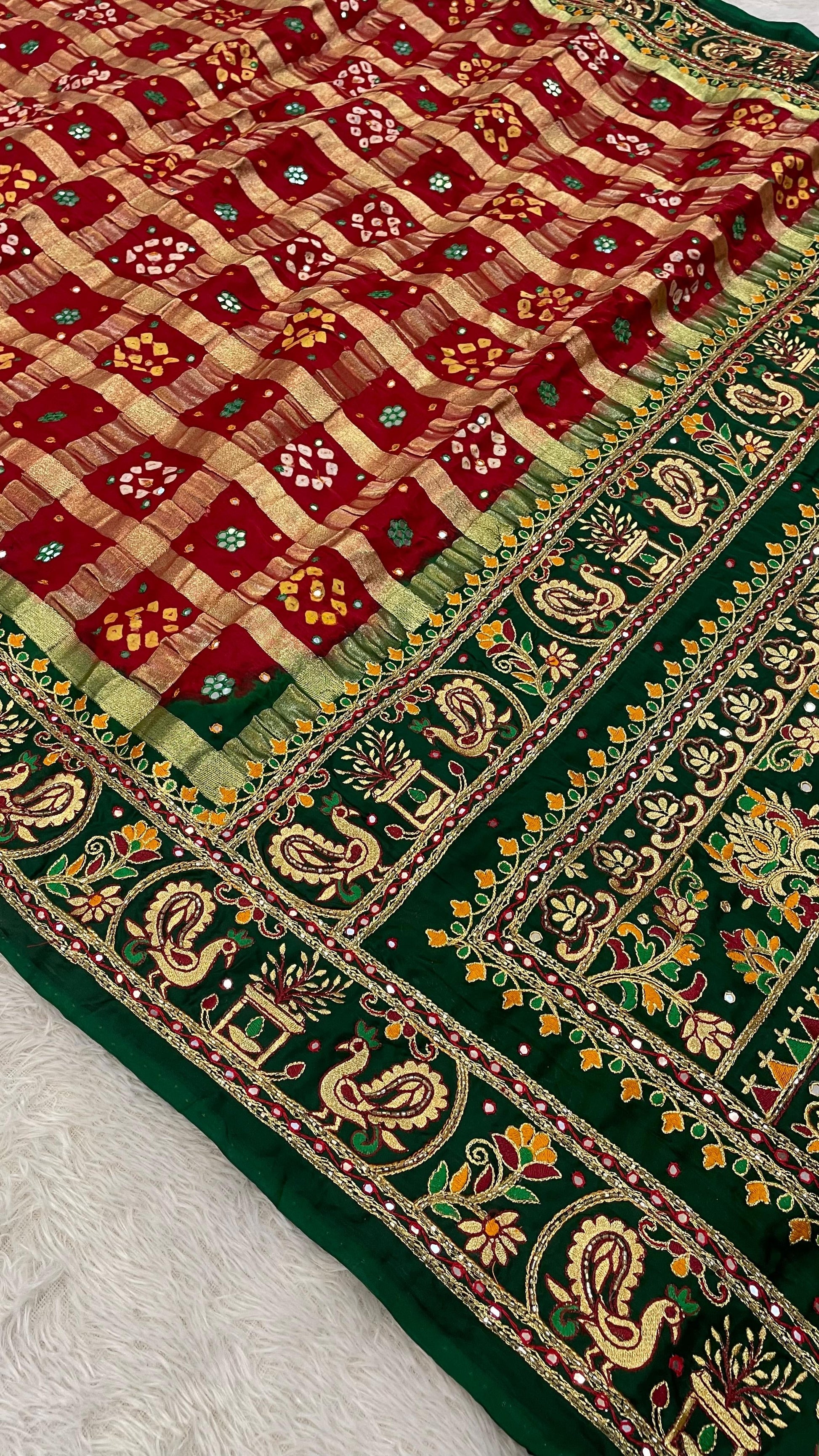 Intricate Handwork Detailing: Adorned with 100% handwork, the Bhatiya Chex Gharchola design showcases meticulous craftsmanship, adding a touch of uniqueness and cultural significance to every piece.