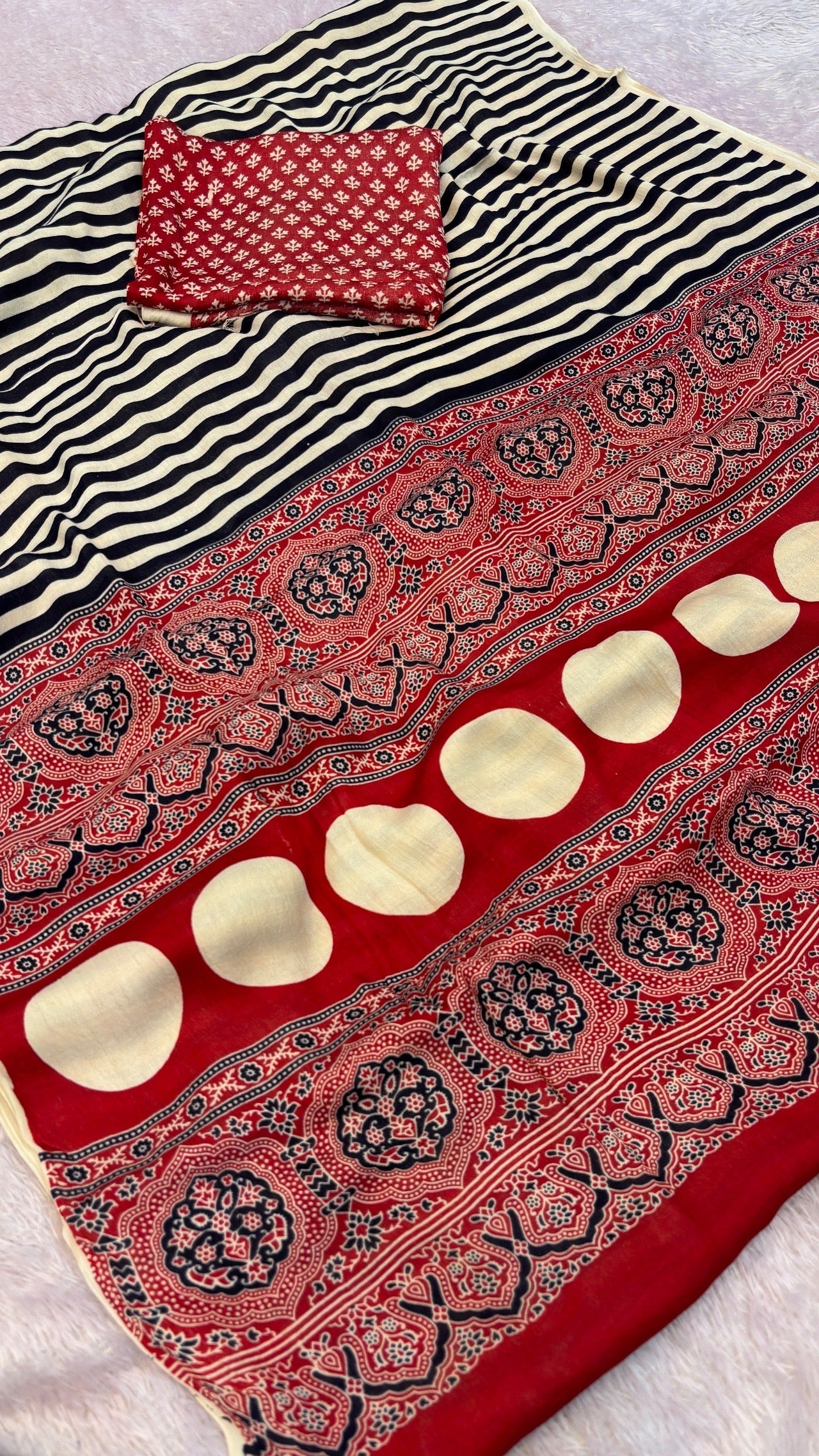Introducing our "Ajrakh" Pure Model Silk Saree, a perfect blend of tradition and contemporary elegance. This saree features the timeless Ajrakh print, adorned with intricate badam butta motifs that reflect the rich heritage of craftsmanship. Crafted on pure Model silk, it offers a soft and luxurious drape, making it ideal for both casual and festive occasions. Available at an unbeatable price of just ₹1350, this saree is a must-have addition to your ethnic wardrobe.